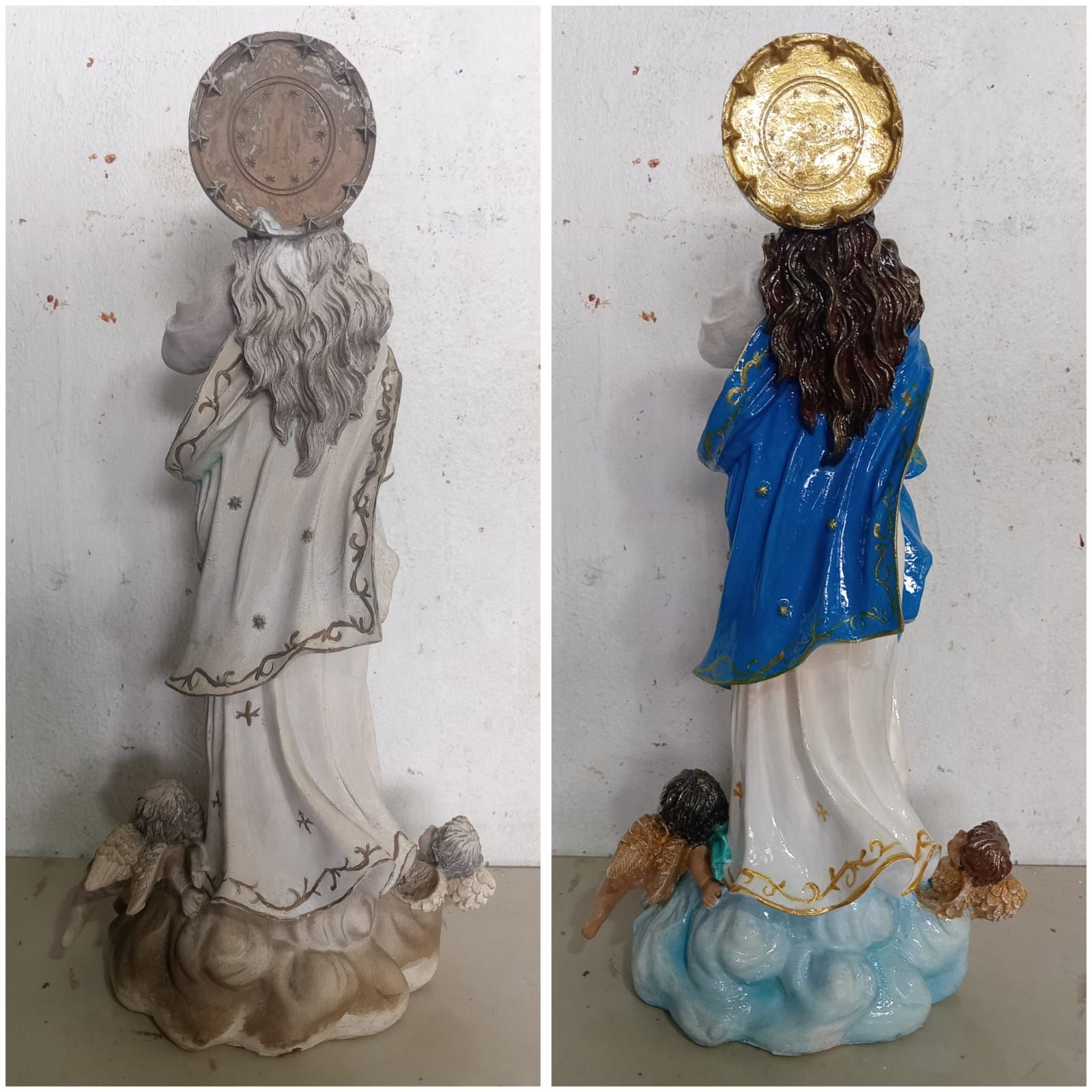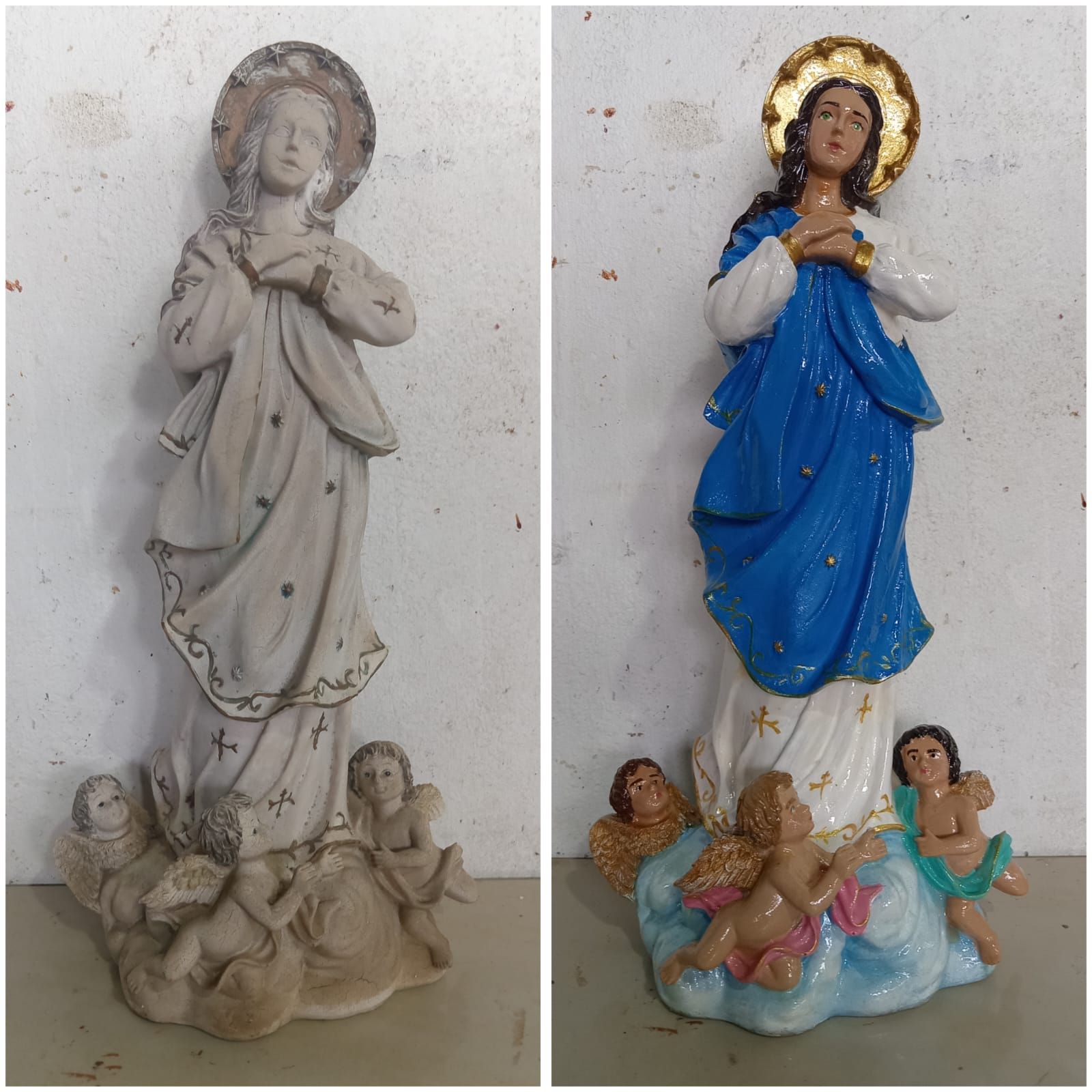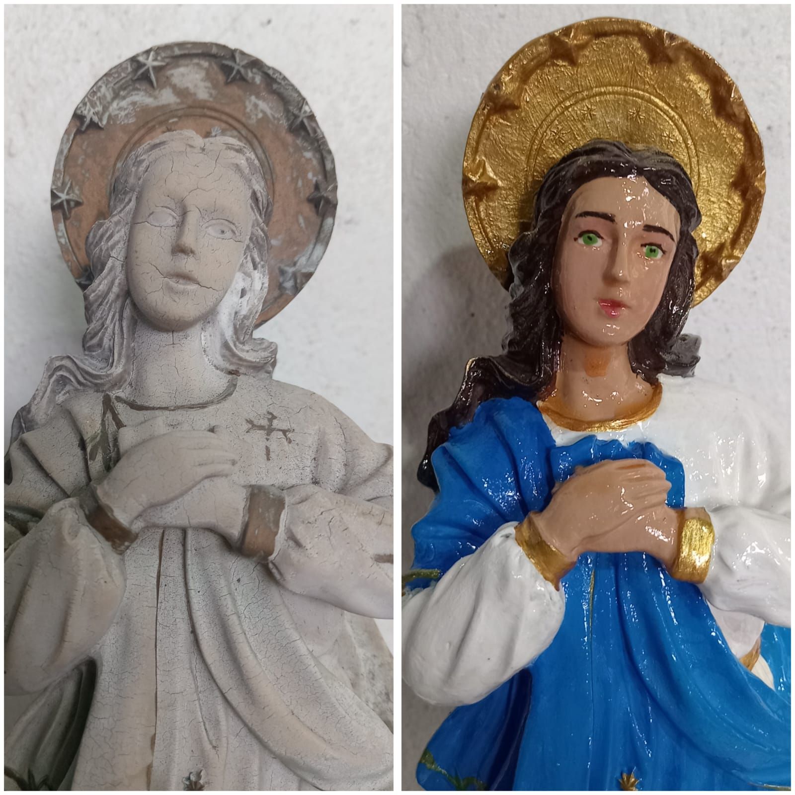 En cuanto a la restauración, desde 1995 me dedico a reparar y pintar diferentes objetos como son: las imágenes (de Santos y Vírgenes) de cualquier material (yeso, plástico, madera, cemento, antiguas o modernas), también he reparado objetos de madera, metal, porcelana (esta ultima ya no reparo, ni objetos de arcilla).
